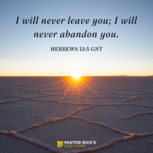 Yesterday we saw that David sometimes complained of God’s apparent absence. But the truth is, God hadn’t really left David, just as God will never leave you. God has promised repeatedly, “I will never leave you; I will never abandon you” (Hebrews 13:5 GNT).