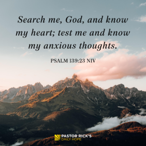“Search me, God, and know my heart; test me and know my anxious thoughts. See if there is any offensive way in me, and lead me in the way everlasting” (Psalm 139:23-24 NIV).