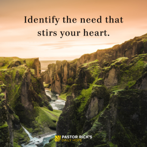 If you want to discover your destiny, the first step is to figure out how God has gifted you. Then, you have to identify the needs that stir your heart. What is it that upsets you? What causes you to think, “Somebody ought to do something about that”? What bothers you so much that it moves you to action?
