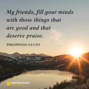 That’s why, when you’re tempted, you need to change your focus. Philippians 4:8 says, “ . . . My friends, fill your minds with those things that are good and that deserve praise: things that are true, noble, right, pure, lovely, and honorable” (GNT).