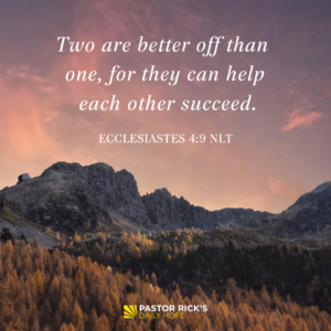 The Bible says, “Two are better off than one, for they can help each other succeed. If one person falls, the other can reach out and help. But someone who falls alone is in real trouble” (Ecclesiastes 4:9-10 NLT).