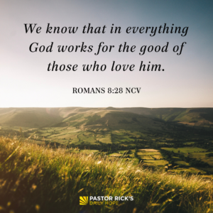 One of the greatest comforts when you’re going through troubles is God’s promise in Romans 8:28: “We know that in everything God works for the good of those who love him . . . ” (NCV).