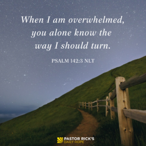 Just like David, trust God in the dark valleys, and pray, “When I am overwhelmed, you alone know the way I should turn” (Psalm 142:3 NLT).