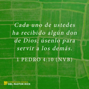 “Dios, de su gran variedad de dones espirituales, les ha dado un don a cada uno de ustedes. Úsenlos bien para servirse los unos a los otros”. 1 Pedro 4:10 (NTV)