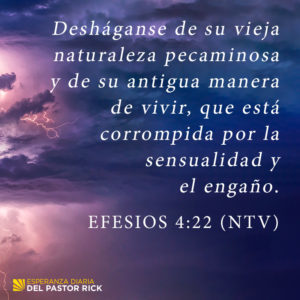 “Desháganse de su vieja naturaleza pecaminosa y de su antigua manera de vivir, que está corrompida por la sensualidad y el engaño”. Efesios 4:22 (NTV)