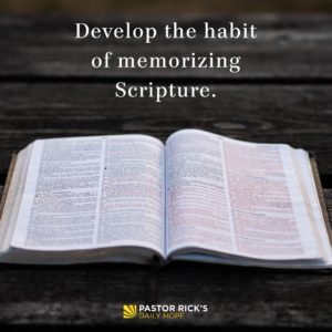 Finally, remember the Bible. James 1:25 talks about people who, after reading God’s Word, remember what they have heard. Nothing will do more for your spiritual life than developing the habit of memorizing Scripture. Psalm 119:11 says, “Thy word have I hid in mine heart, that I might not sin against thee” (KJV).