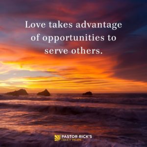 Every day God puts opportunities around us to demonstrate love. The problem is most of the time we’re too busy. How many times have you thought, “I need to make a call; I need to encourage that person at work; I need to help my neighbor,” but then you missed the opportunity because something else came up? Love takes advantage of opportunities to serve others.
