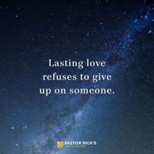 Lasting love refuses to give up on someone. You can know this because Jesus modeled this kind of love for you. When you were dead in sin, he didn’t walk away. He didn’t just wait it out. He didn’t hold it against you. He didn’t even expect you to pay for what you’d done.
