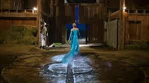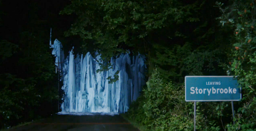 Zipping to the present time, we see Elsa emerge from the symbol on the barn floor and enter Storybrooke. She walks along the darkened streets and almost gets run over by Grumpy's truck. She hits them with a wall of ice to prevent the accident.
