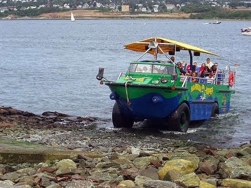 They spin around in an amphibious vehicle. That's a car that can drive on land and be a power boat on the water. We have several in Halifax for tourists, they're called the Harbour Hoppers.