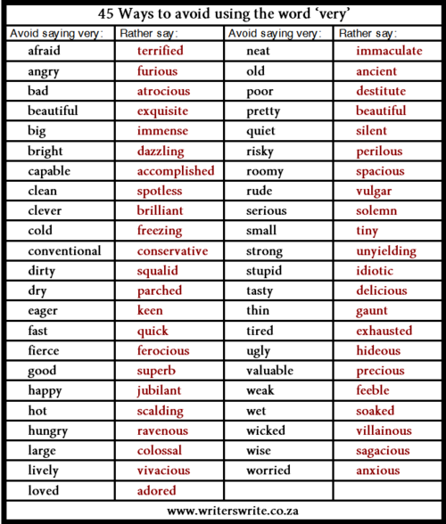 4. Very. This is perfectly acceptable for the first draft, but there's always a better way to convey the same idea. "Very clean" can be replaced with "spotless".