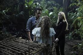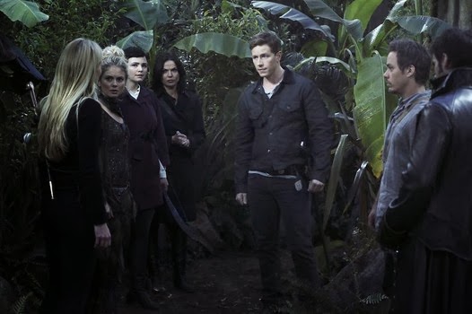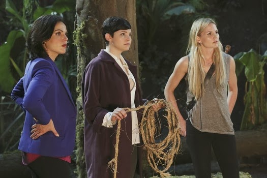 Mary Margaret trips or something stupid and manages to trap all three of them to the Thinking Tree. As vines tighten around their chests, Peter Pan struts out of the jungle and says the only way they'll be reunited with Henry is in death.