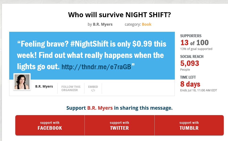 Click this link to my Thunderclap page and chose either “Support with Tweeter” or “Support with Facebook” or both! It is completely safe and will automatically post one message on your behalf. Then add your name to the Thunderclap and on July 18th everyone that has signed up will automatically post a link to the message about Night Shift and help spread the word about the sale!