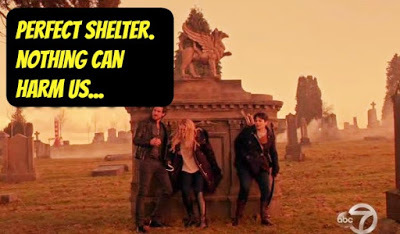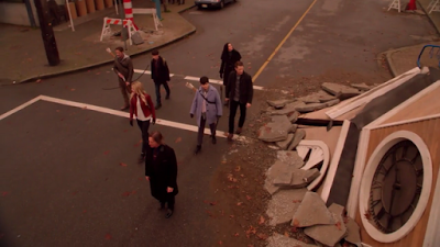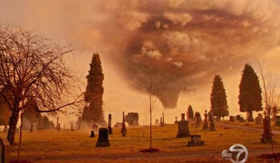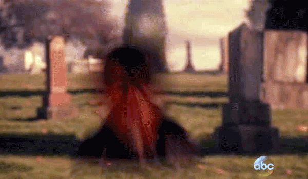 Emma, Hook and Snow White are in the graveyard trying to outrun a sudden tornado. Hook leads them to a monument that can only shelter than on one side.