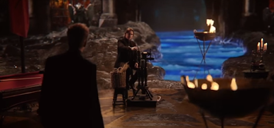 Belle finds Mr. Gold and tells him Gaston is really upset now that he knows they're married. Literally two seconds later, Mr. Gold is doing the hovering choke hold to Gaston over the harbor. Belle stops Mr. Gold, but then she and Gaston fight and she manages to push him off the dock.