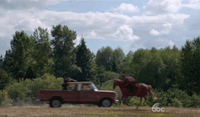 #3. This truck versus horse jousting scene from Episode 3 that should have resulted in Arthurs' death. More ridiculous than the wigs above.