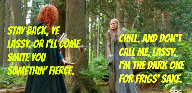 Anyway, Hook manages to convince her love is the answer and she does the ole heart transplant. Merida goes on her way, ready to take the path of peace instead of the bloody fight she was planning on doing once she found her brother's kidnappers.