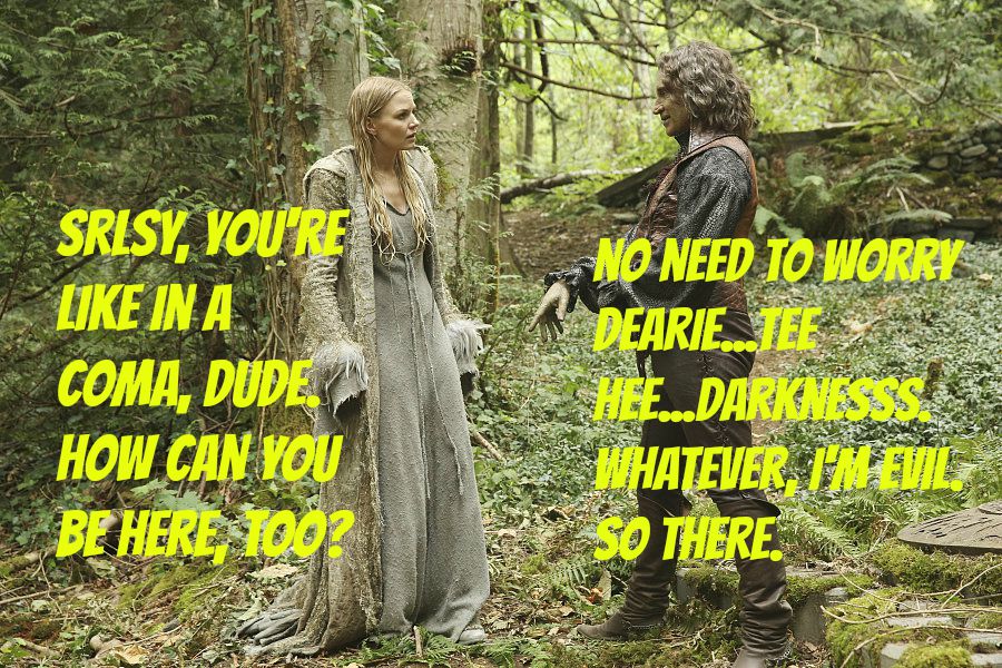 Meanwhile, Emma discovers the enchanted forest is full of peasants who aren't exactly cooperative. Rumpelstiltskin keeps talking in her ear like the little devil that sits on your shoulder who rationalizes all your bad behavior.