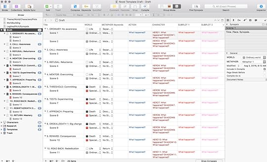 Just so you know, it's not final and will probably evolve. Hell, it's not even half-final. It's like the very first version I made from scrubbing through the internets and the books and the blogs, and coming up with a kind of a hodge-podge concoction that works for me. For now. (Also, it's mostly based on the Hero's Journey plotting pattern thingy.)