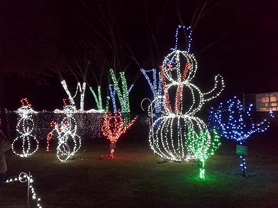 The picture is from a holiday light display at Hobgood Park, a local green spot here in Woodstock, GA. For the sum of $10, you were transported into a magical, LED-lit world of wonder. The displays ranged from small, animated pieces to large snowmen and reindeer pulling bright wagons. One of Santa's helpers on the grounds said a million lights were used, and I believed him. Lights were everywhere. Even on the snack bar! :)
