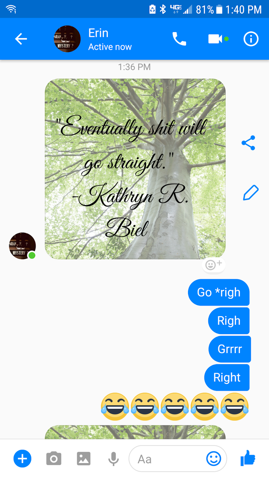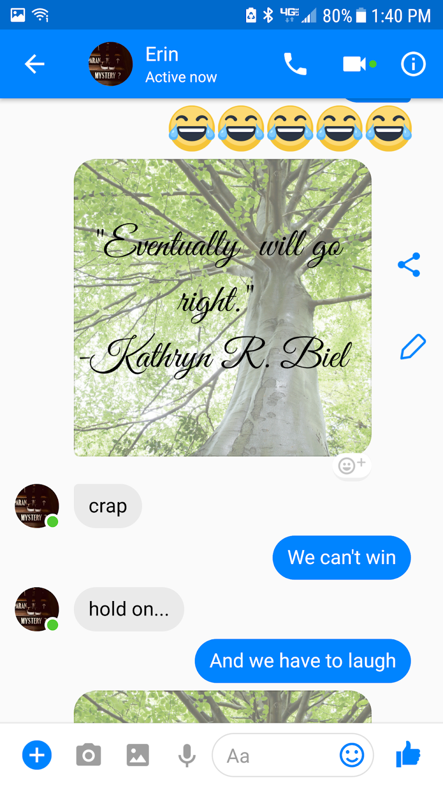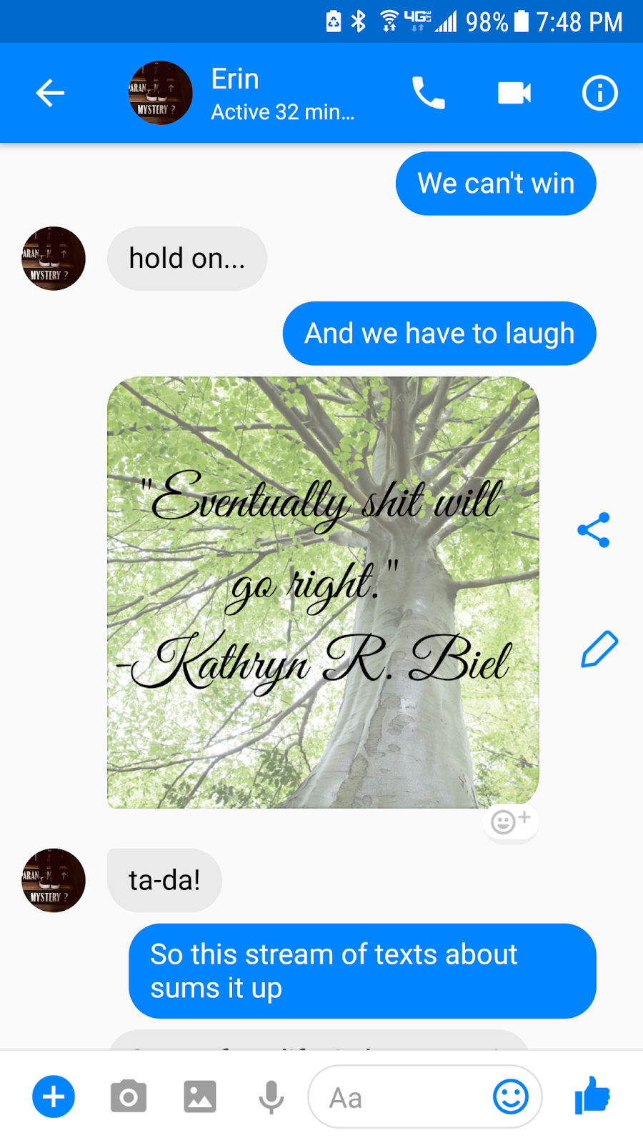 So like the friend I am, I wrote her some nice words of encouragement. Despite the fact that people pay money to read my books, sometimes I'm not the most eloquent. I also use inappropriate humor as a defense mechanism. So I sent Erin a message that said this,