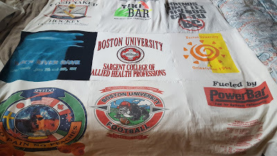 Fast forward 6 years and 10 books. My husband has been encouraging me to get rid of the stuff we no longer need. We've cleaned out the baby clothes and toys. Made countless runs to Salvation Army to donate furniture. It's hard, as I feel like I'm giving away my children's childhoods. So, when it came time to clean out my closet, I struggled with a massive pile of t-shirts I've held onto since my college days. T-shirts from sporting events. From orientation. From concerts. From Spring Break. The shirt I bought when I decided to go to BU. While I would occasionally wear one here or there, I certainly no longer need a massive pile. So I decided to make a t-shirt quilt. The plan is that it will go in my office, once my office is finished (we're finishing our basement and the now playroom will become my dedicated writing space).