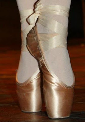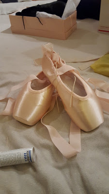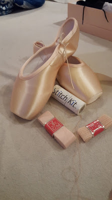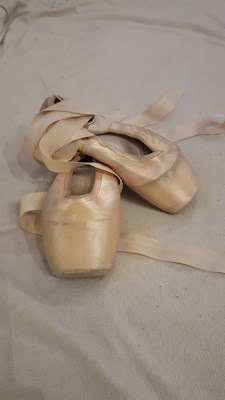 And with anticipation and sadness, I started sewing the ribbons and elastics on what will most likely be my last pair of pointe shoes. If these last as long, I'll be about 45 the next time I'm in the market for a new pair. If the arthritis in my toes has it's way, I won't be getting a new pair.