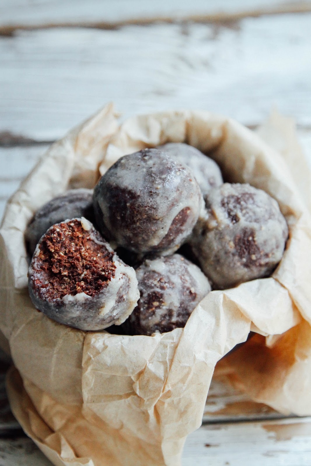 Baaaaaabes: it's donut hole time again. I shared a recipe for vanilla donut holes (inspired by Lee Tilghman) a few weeks months ago and you all seemed to love it so I figured I'd provide a chocolate version as well. But more honestly: I just wanted glazed chocolate Tim Bits so I made my own raw vegan ones. I am truly a selfish human and have no shame in admitting it.