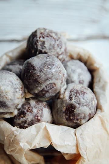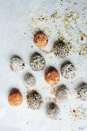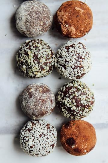 To make the balls: in a food processor, grind the dry ingredients into a rough flour. Add the rest of the ingredients and keep processing until a moist dough is formed. Ideally it will form itself into a ball, or at least when you press some of the mixture between your fingers, it will hold its shape and your fingers will be slightly oily. If the mixture is too crumbly, add more water, coconut oil, or dates. If it's too moist, add some more oats.