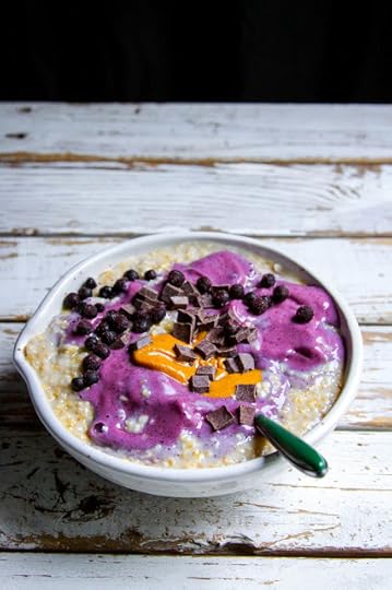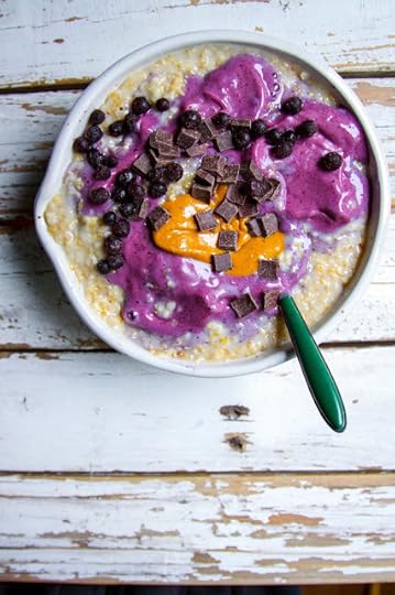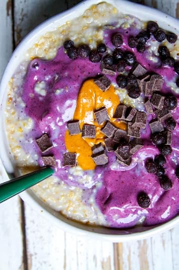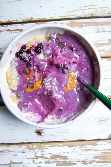 To make the nice cream: blend all ingredients until purple and like soft serve. Scoop into a chilled bowl. Pour your oats over the nice cream and top with some goodies. Enjoy immediately!