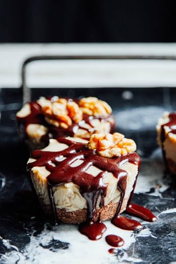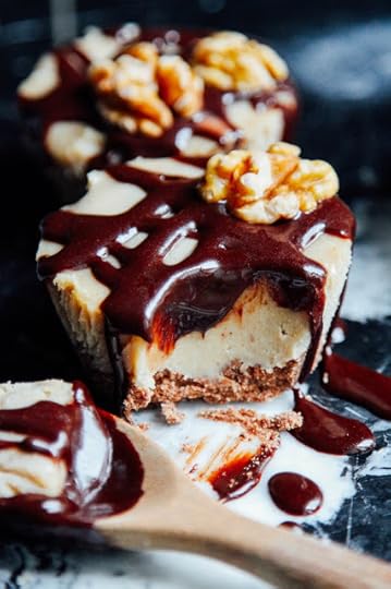 To make the crust: stir together all the ingredients until you get a semi-crumbly mixture that holds its shape when pressed between two fingers. If it's still too crumbly, add some more water. Press the crust into lined cupcake molds and then fill with the cheesecake mix. Leave in the freezer or fridge overnight. Gently remove the cheesecakes from the molds.
