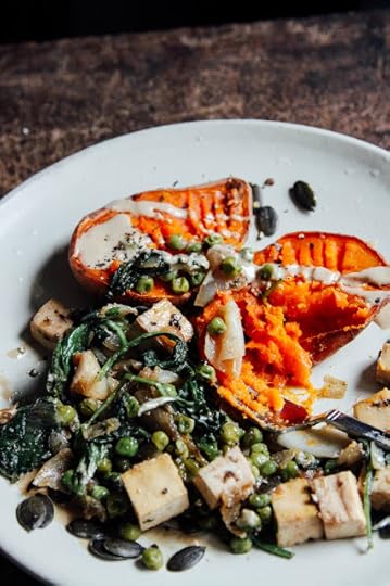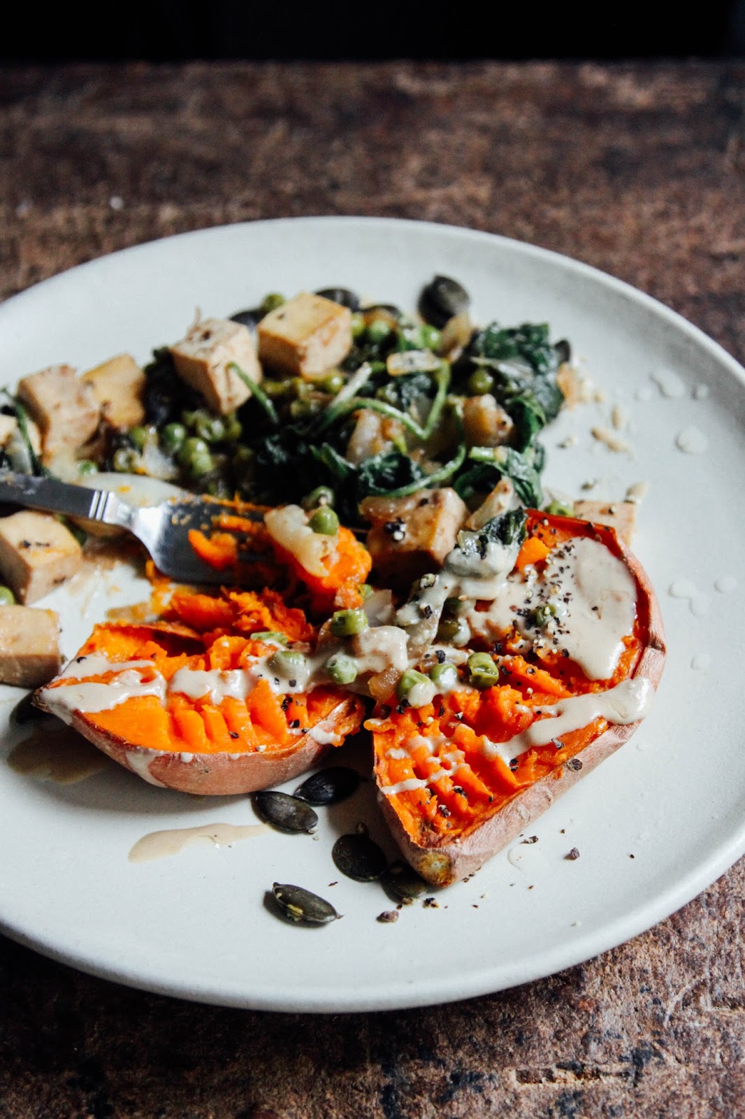 Plate your yam, throw on the veg and tofu mix, and finish with the toppings. Nom.
