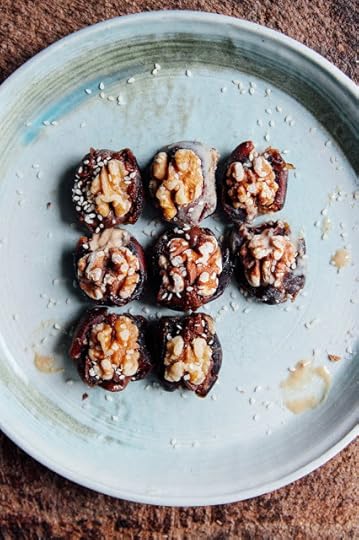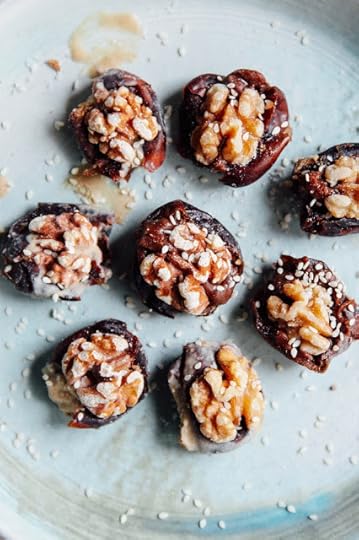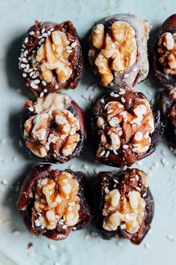 NOTES: you can use any variety of dates, medjools work well because they are giant, but lately I've been preferring Bam dates (aka Mazafati dates, according to wikipedia). You can use any nut or seed butter you like. You can add whatever toppings you want, I threw on some sesame seeds for aesthetic reasons here. And use any nut to top the bites with! I just had walnuts nearby me so I used walnuts.