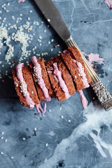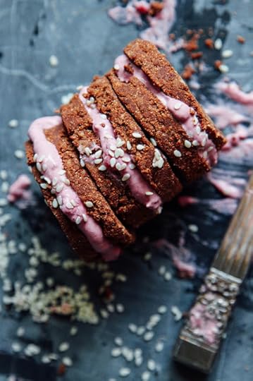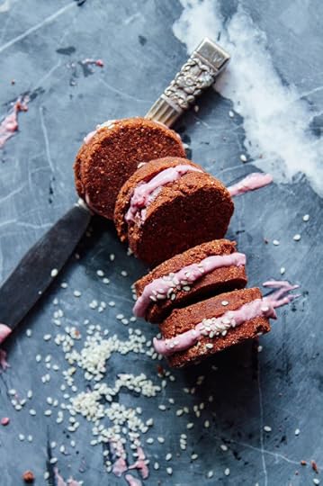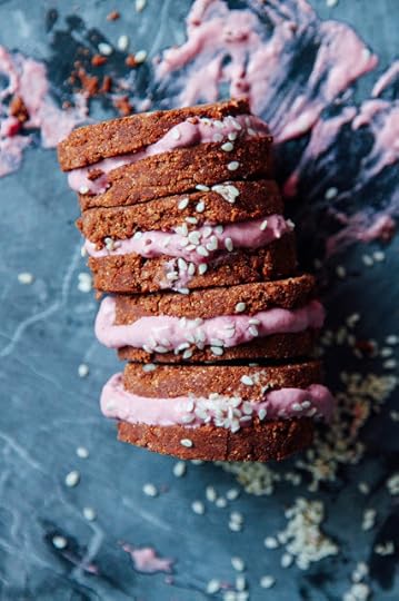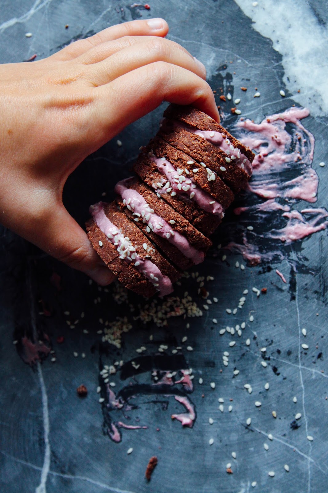 To make the ice cream (you will definitely have leftovers, eat it as you finish up the recipe): blend the mango and berries together, adding a tiny amount of coconut milk if needed. It should be like sorbet but we are calling it ice cream... shh. Spread a bit on top of your cookie and put back in the freezer until the ice cream is solid.