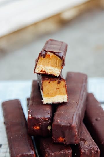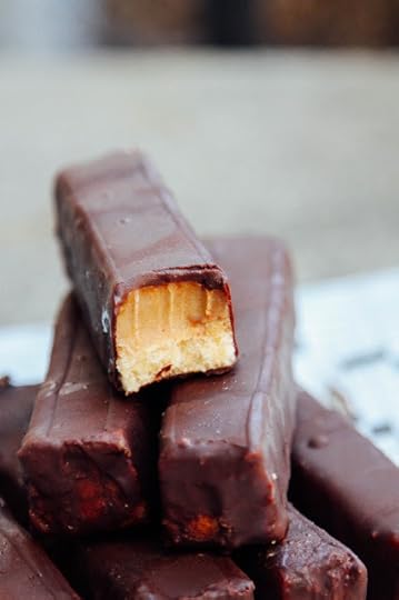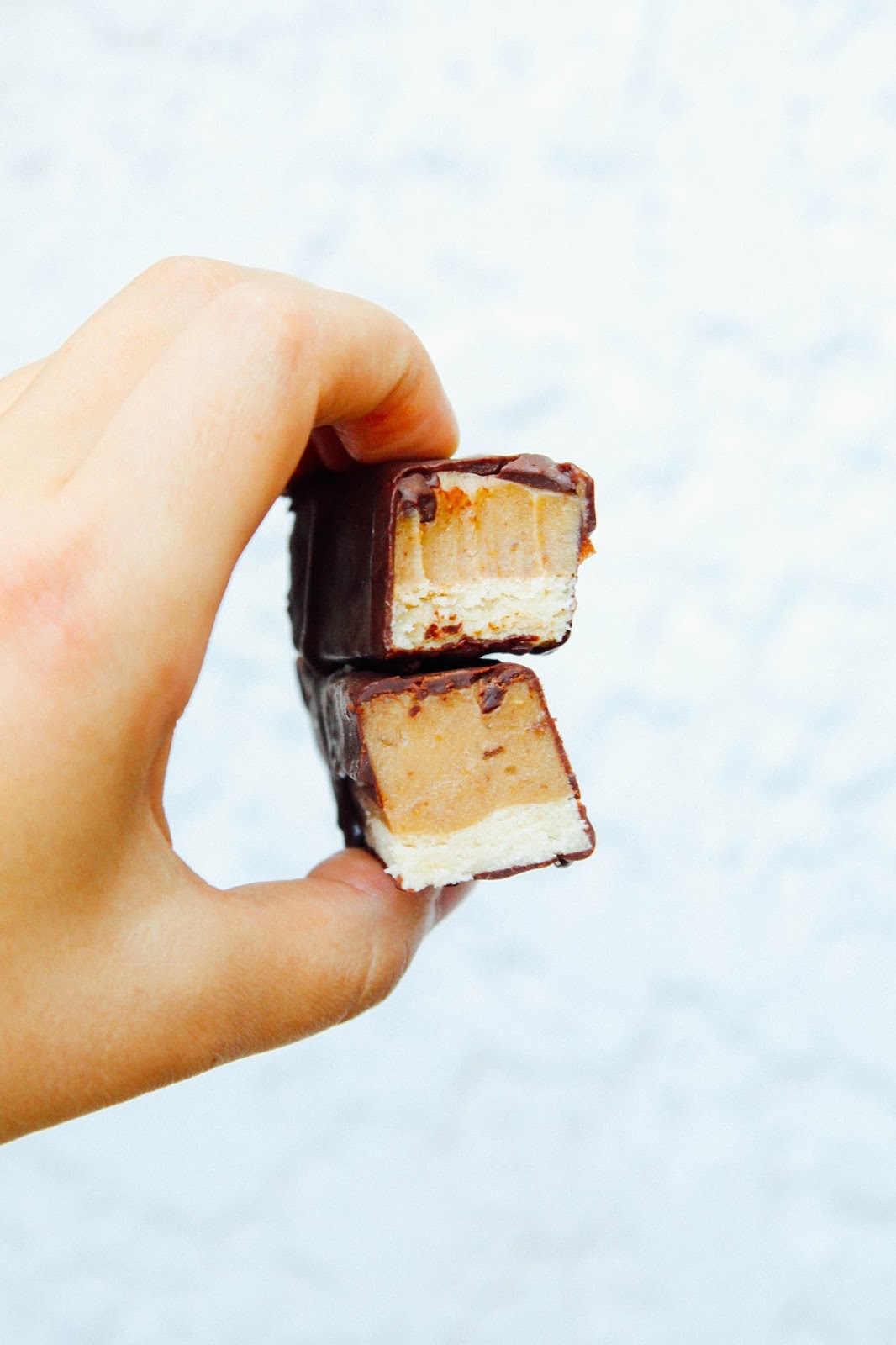 This recipe is 100% inspired by and adapted from The Coconut Goddess. I saw their raw vegan Twix bars on Pinterest or somewhere a few days ago and my heart was like: "Hey we need to make these today, mkay??" So I did, with my own tweaks. They are soooo decadent and delish. I have been eating them as energy snacks on bike rides and after the gym, etc. They are mainly made up of nuts and dates: first we've got a cookie layer followed by caramel, finally all coated in dark chocolate. YOU CAN'T GO WRONG. Make a bunch and keep 'em in the freezer for a quick, sweet snack whenever ya feel like it. Probably a great choice if you're trying to move your kids' treats in a healthier direction too. Or any human's treats.