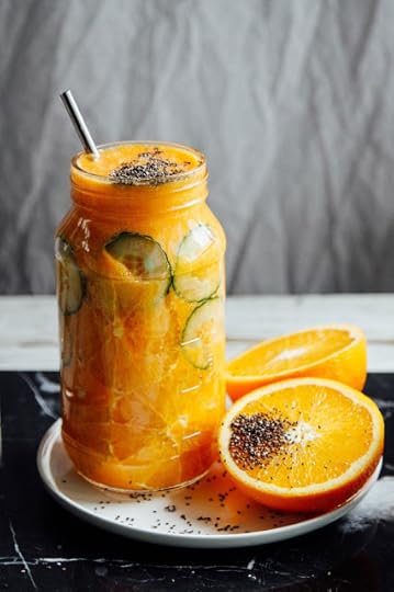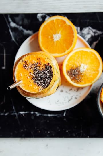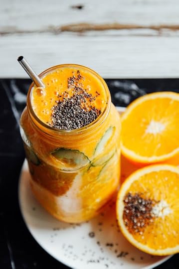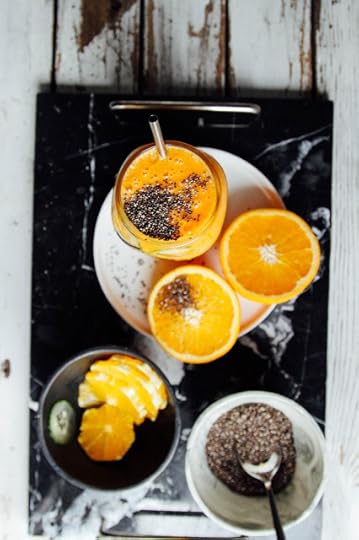 Blend all ingredients together - except the chia seeds - until smooth and delicious. Adjust according to preference, add more milk, fruit or some ice if you like. I personally like my smoothies with a thinner consistency and frosty cold. Decorate your glasses with sliced fruits (I used orange and cucumber), sprinkle on the chia seeds and enjoy!