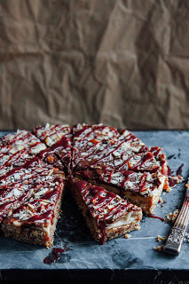 VERY DECADENT AND RICH! BUT ALSO REALLY GOOD FOR YA! This tart is full of healthy fats, fibre and probably a decent amount of protein too. We've got a crust made from dates, oats and almonds topped off with a date-based salted caramel and smooth chocolate layer. The finale is a deliciously tart, sweet drizzle made with Oh My Glow Superfood Beauty Blend: with ingredients from whole foods like berries, maca root, lucuma and chia seeds. I love adding it to smoothies but wanted to try something a bit more creative here. It blends perfectly with coconut oil and maple syrup into a luscious, deep red mixture that has a butterscotch-y consistency.