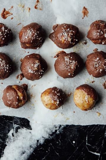 To make the chocolate: stir together the ingredients until smooth. Dip the truffles in the chocolate, the chocolate should harden pretty fast, so dip them another one or two times if you like. Sprinkle on the salt and put the truffles in the fridge or freezer, enjoy whenever you like! Leave them in the freezer if you want them more firm, or the fridge if you prefer a softer texture.