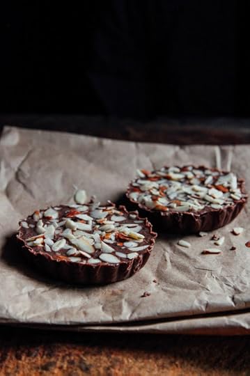 Melt the coconut oil in a pot, then stir in the cacao powder, maple syrup and vanilla extract. Line a couple single-serving tart tins with tinfoil or plastic wrap. Pour 1/4 of the chocolate mixture into each of the bottoms of the tins, scoop on a spoonful of peanut butter then pour on the remaining chocolate mixture, covering the peanut butter layer. Sprinkle with almond slivers and put in the freezer for at least 30 minutes, or until solid.