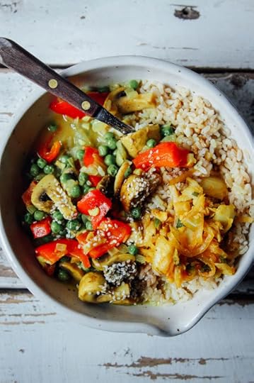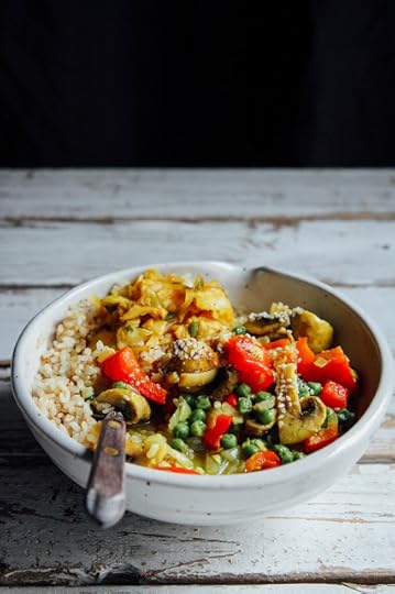 To make the curry: mince the onion, garlic and ginger. Roughly chop the mushrooms and bell pepper. Heat the coconut oil in a pot on medium heat and add the chopped onion, garlic and ginger. Once the onions are translucent add the curry paste and mix it into oil. Add the turmeric and black pepper, then the mushrooms and bell pepper, mixing it all up so the veggies are coated in the spices and oil. Add the coconut milk and let the curry simmer until it's thickened up and the veggies are tender. Throw in the peas and as soon as they are cooked, take the curry off the heat and enjoy it with some rice! This would be delicious topped with some roasted peanuts and cilantro as well. Just saying.