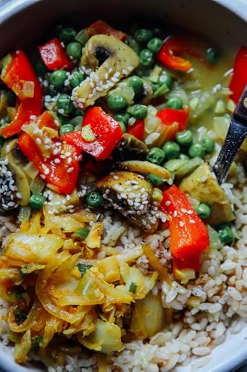 The turmeric is the reason this "green curry" isn't really that green. Turmeric makes everything orange or yellow. Remember that, kids. I have stained a great many things orange / yellow accidentally thanks to this flavourful lil plant (which sidenote: is a cousin of ginger). I added a few other veggies we had in the fridge and willed myself to make brown rice instead of white... cuz fibre and stuff. But white jasmine rice is sooooo good. It just makes me feel weird after I eat it. So brown rice AND some kimchi I made a few days ago, I added these to the curry before chowing down. If you want the recipe for the kimchi, let me know! I am happy to share it, though FYI it's mostly copied from The Kitchn. I truly hope you try out this recipe and enjoy it. I liked it. That is why I am sharing it.