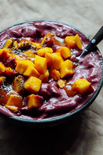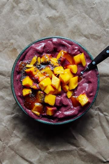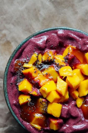 The recipe is simple enough (as usual): basically just a bunch of frozen fruit blended together with coconut meat. Then instead of plain maple syrup I made a baobab caramel type thing; it's actually kinda freaky how it resembles caramel once you stir together the ingredients. Finally we top it all off with fresh mango and chia seeds because why not. I hope you thoroughly enjoy it. Definitely recommend pouring extra maple syrup on it.