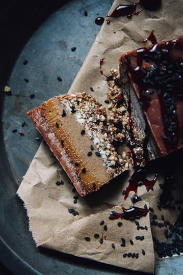 To make the chocolate: blend everything until smooth, adding water if you need to. It should be a slightly thinner consistency than the caramel, like chocolate syrup. Pour and spread evenly onto your caramel layer. Sprinkle on pretty things. Put in the freezer for a few hours until it's solid and the caramel is gooey and holds its shape when cut. Alternatively, leave it in the freezer overnight and then wait for the whole thing to thaw enough so you can cut it.