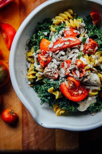 The best thing about this cheese sauce is that it is made out of mainly potatoes and carrots. It's oil-free and gets its fat content from walnuts, which are super good for ya. What does all this mean? IT MEANS you can eat as much of this sauce as you desire, and you'll most likely still feel real good! As I said, I really like having it with rice and steamed kale, but you can serve it with whatever you prefer: any other whole grain, rice noodles, wheat noodles, buckwheat noodles, on veggies, on nachos... the list goes on. Get creative, or don't. But in any case, try it out and let me know what you think. Personally, I am obsessed. In the recipe I give below, I had the cheese sauce with kamut pasta, steamed kale, sunflower seeds and tomatoes from the backyard. It was heavenly.