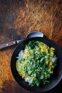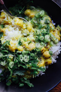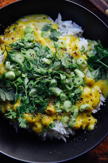 Finally sharing this amazing recipe from Richa Hingle's newest cookbook. It is the best curry I have ever had / made and you need it in your life, even if you think you're doing ok without it (... you're the ones you need it most). I've tried a bunch of other recipes from the book - Vegan Richa's Indian Kitchen - as well and loved them all; like spicy potato-filled samosas, flavourful veggie-filled dishes and loads of DIY spice mixes. The recipe I am sharing from the book today is magical for me since I've always adored curries but have never been very good at making them. This curry is sweet, spicy, SO CREAMY, thick, and basically just mango, coconut milk and garam masala. When you pair it with rice and cilantro, the whole world kind of falls away as you take a bite; you and the curry become one. I was trying to listen to The Savage Lovecast while I ate it but it was hard to concentrate because of all the flavour explosions that were happening in my mouth. I'm serious: best curry I have ever had.. and I have had a lot of curry. Now I've said and thought the word 'curry' too many times so it doesn't seem like a real word anymore. Don't you love it when that happens? It illustrates how fluid and temporal the meanings of language actually are.