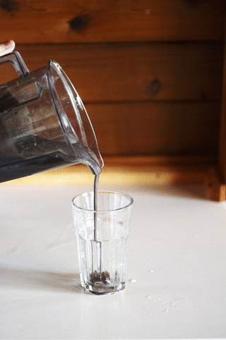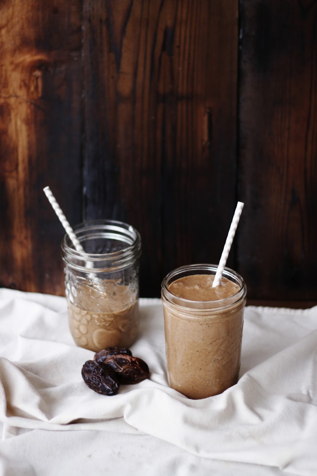 3 frozen bananas1 tablespoon cacao powder1 teaspoon ground coffee beans 1 teaspoon vanilla powder1 teaspoon lucuma powder 3 dates1 cup almond mylk