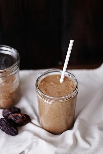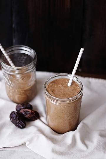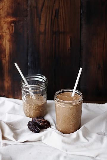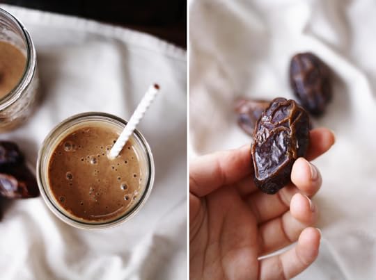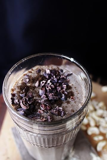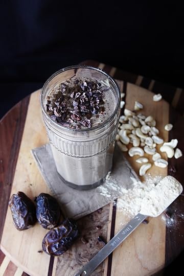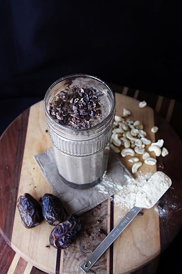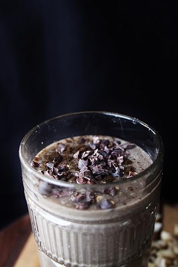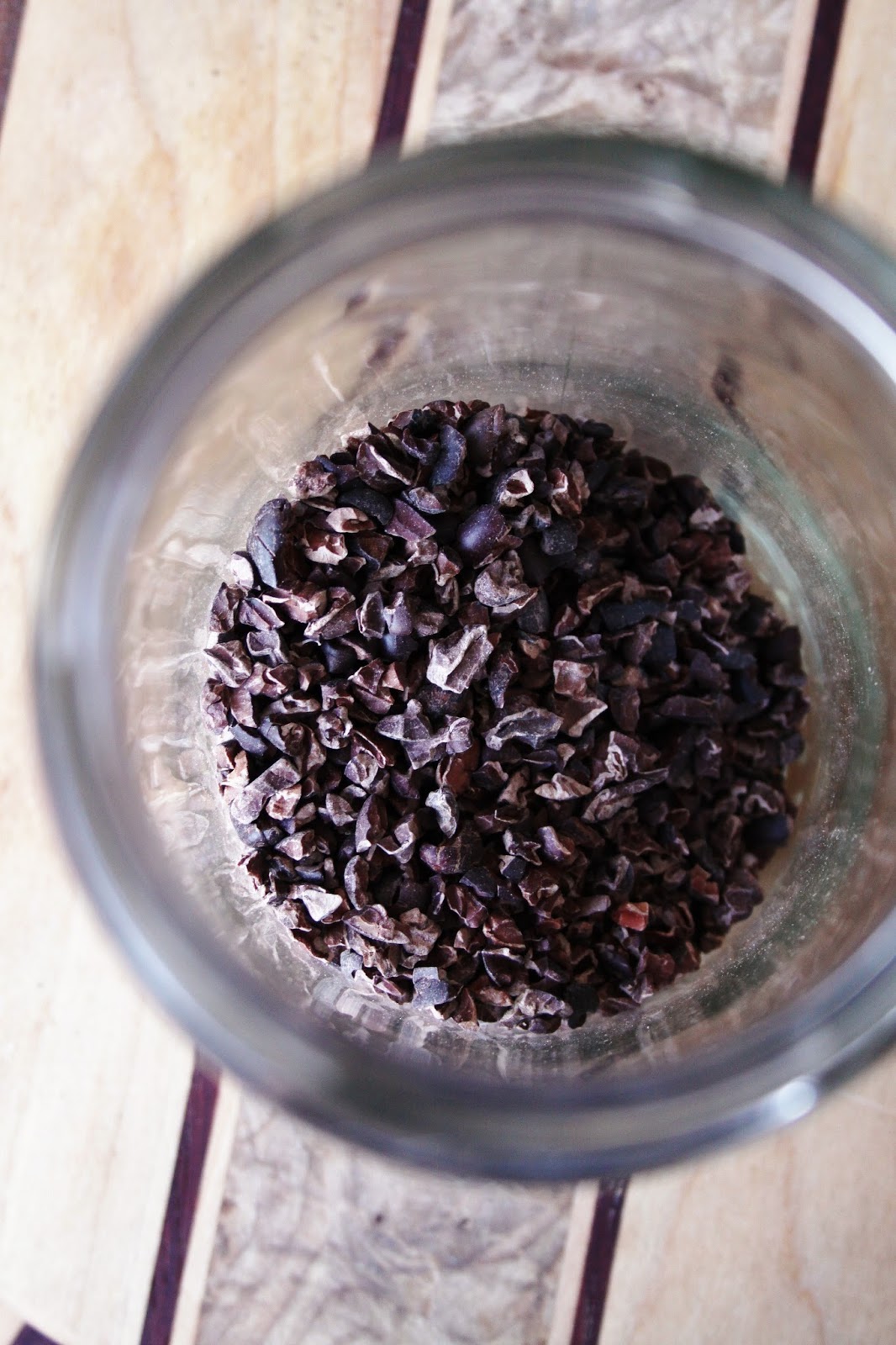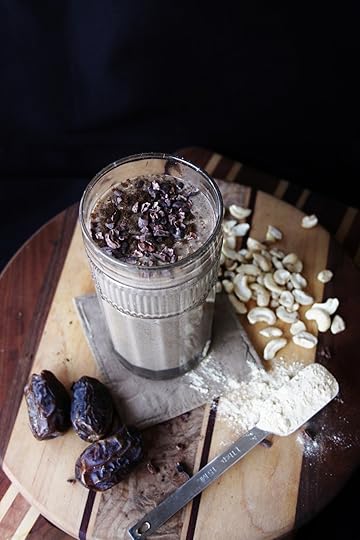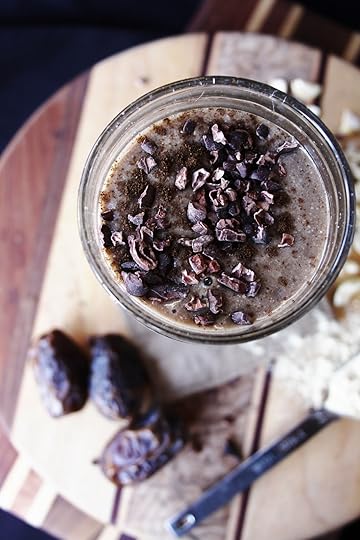 Blend everything together until smooth. Taste and adjust accordingly (add more dates, vanilla, etc.) Top off with cacao nibs to make it look pretty and enjoy!