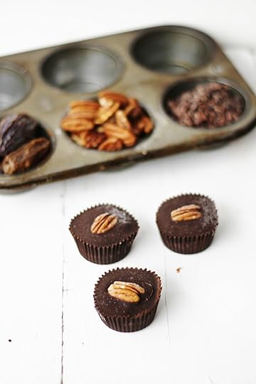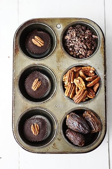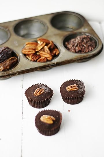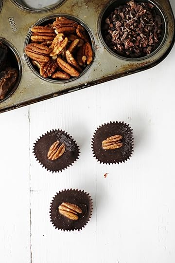To make the date caramel: blend all the ingredients together until smooth, adding water as needed. Scoop into your cupcake papers, then pour on the rest of the chocolate and top off with a pinch more of Himalayan salt and a pecan.