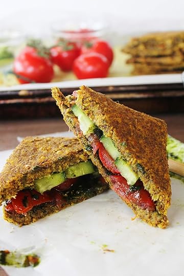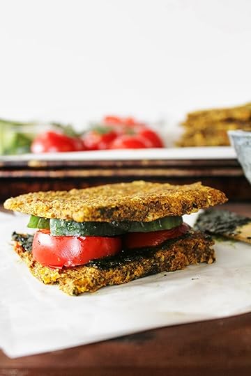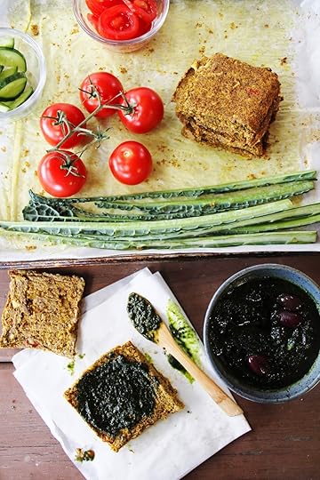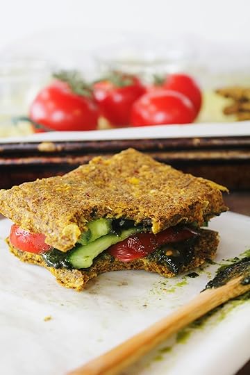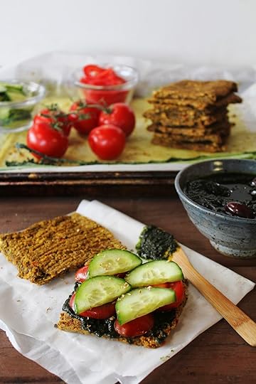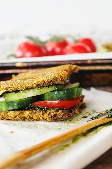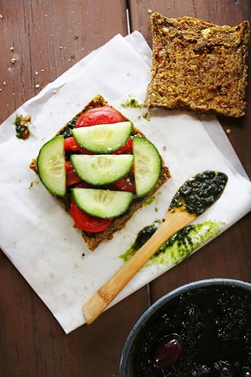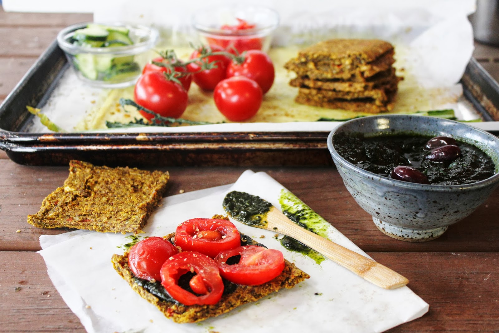 Slice the tomatoes and cucumber and coat lightly in olive oil and spices, set in the dehydrator (or oven at its lowest temperature) until it softens and its skin begins to wrinkle. Spread the tapenade onto your bread, followed by your veg slices. Chomp!