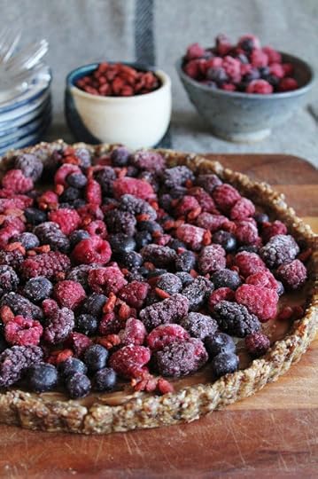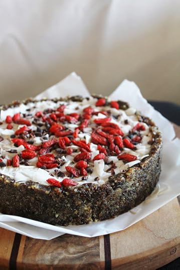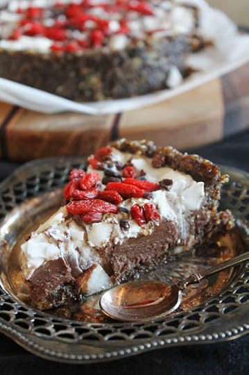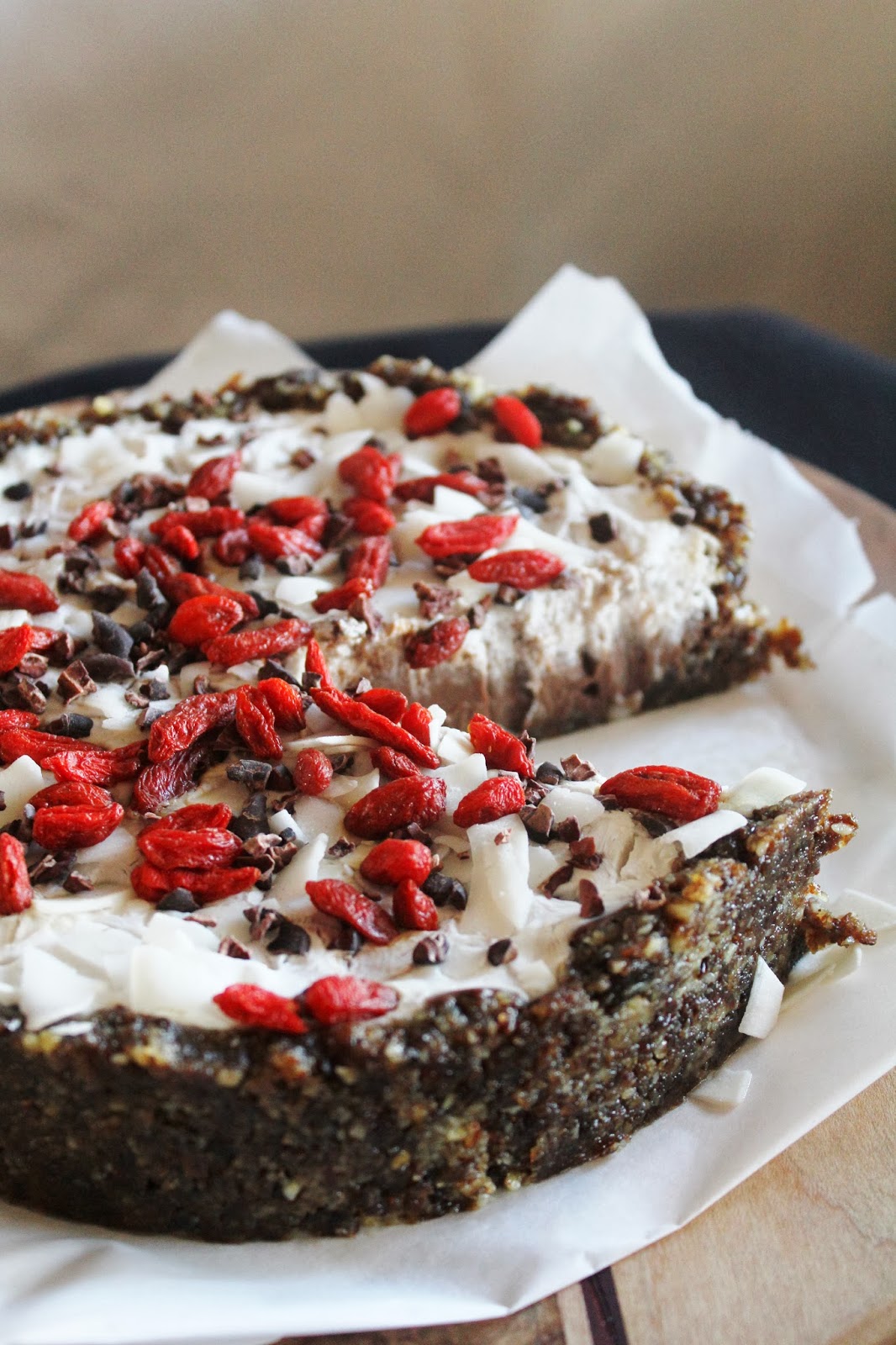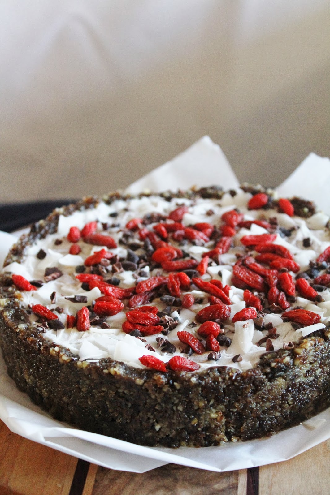 I've made variations of this pie/tart/thing a few times now (click here and here for past recipes) and every time the result is a winner with the crowd I serve it to. It's one of those desserts where you can expect the plates to be licked clean. Why? It's simple, really. You have a crust that tastes like butter tarts, followed by the most delicious and healthy chocolate pudding you can imagine, covered in whipped coconut cream and topped off with goji berries. This here's a no brainer, folks - make this recipe immediately.
